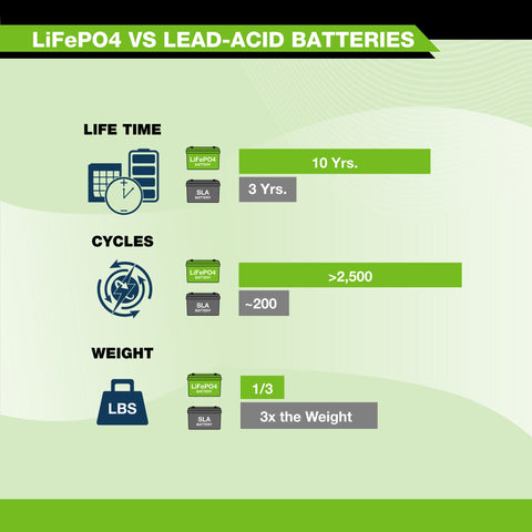 Flat discharge curve holds above 12V for up to 95% of its capacity usage providing huge boosts in run-time compared to only 50% in Lead Acid.