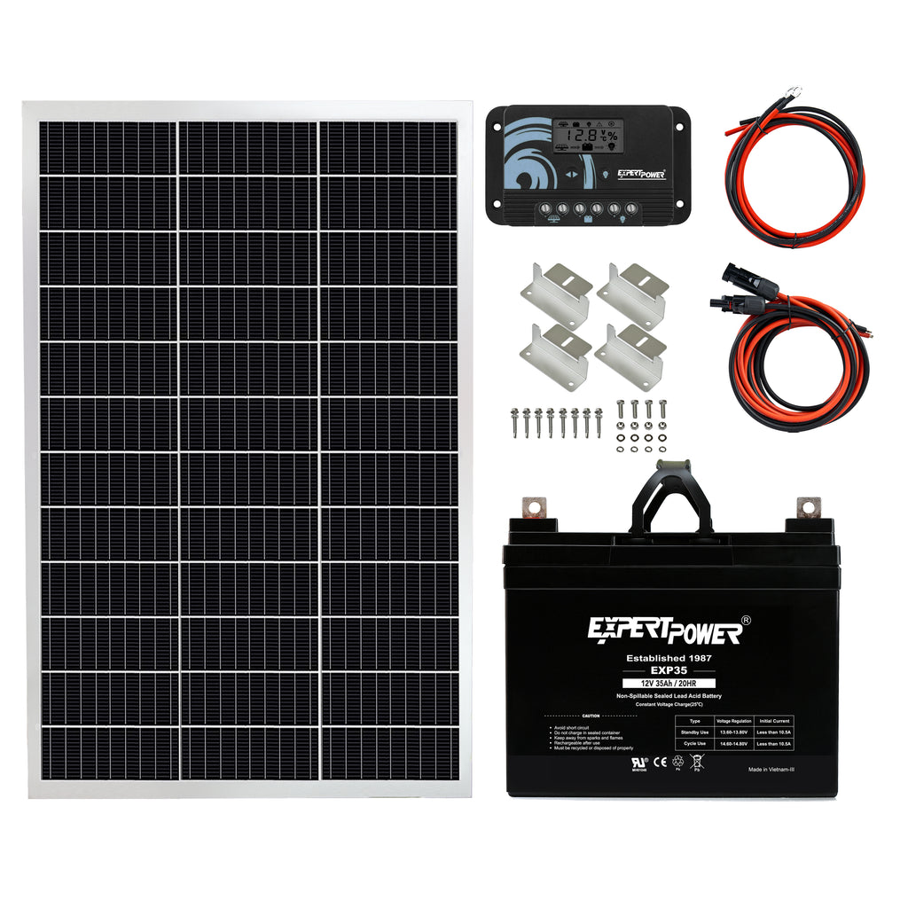 Get ready to power up your off-grid adventures with our ExpertPower Solar Kit! This kit includes all the essential components you need for a starter DIY project. Embrace the sun's energy with the 100W Monocrystalline Panel, utilizing the solar array to charge the included 12V 35AH AGM SLA Battery.