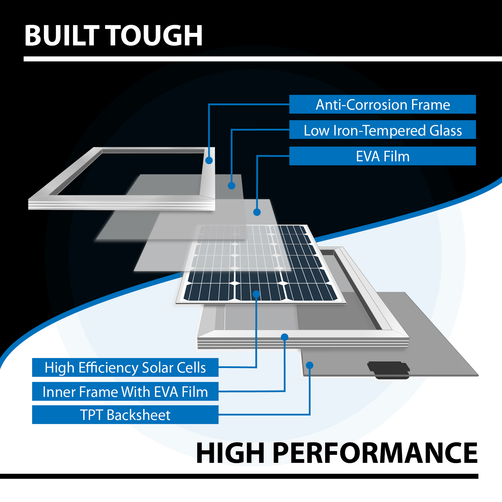 Solid Quality: Panel is made with highly efficient monocrystalline solar cells protected by tempered glass and aluminum frame, which withstand high wind (2400Pa) and snow loads (5400Pa).