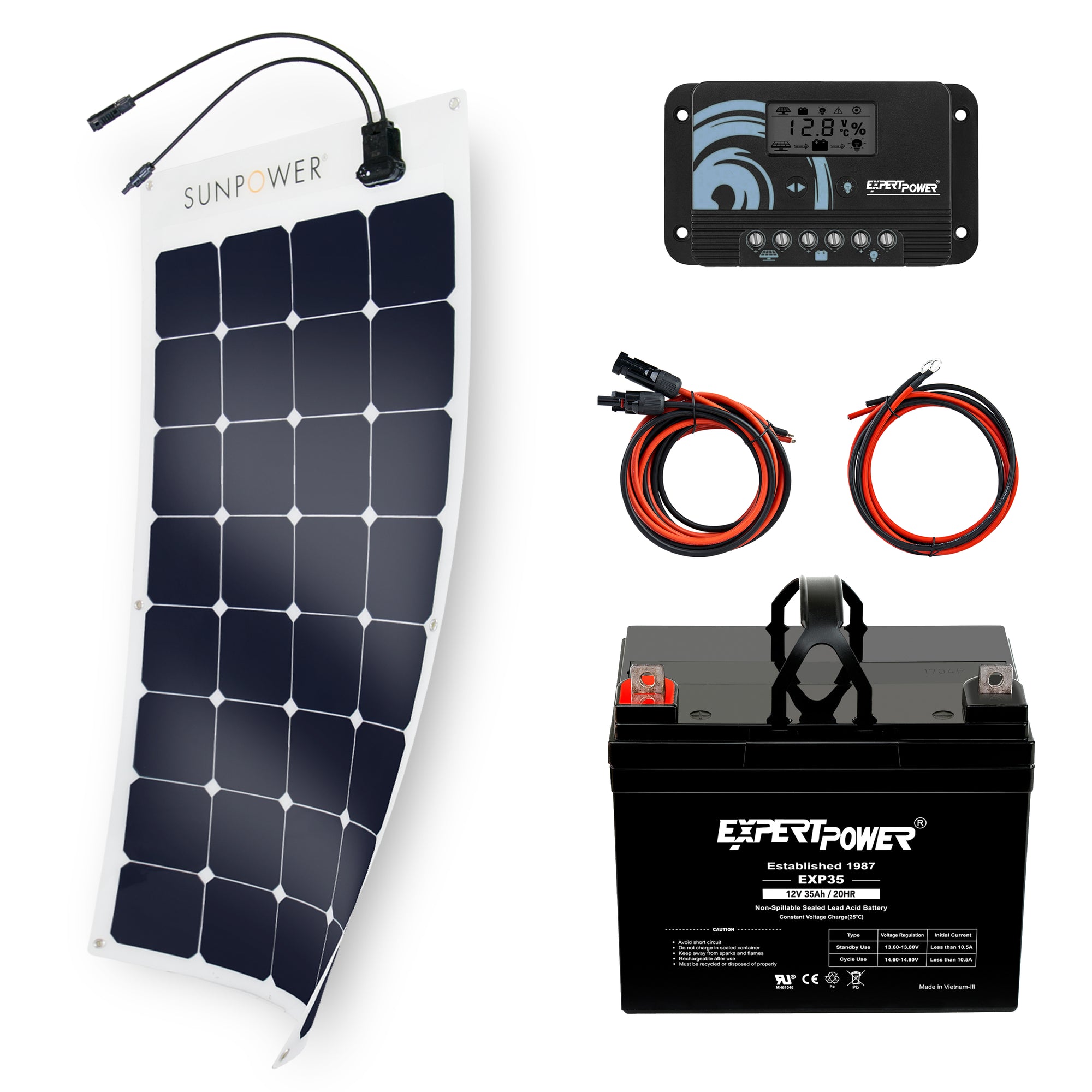 Get ready to power up your off-grid adventures with our ExpertPower Solar Kit! This kit includes all the essential components you need for a starter DIY project. Embrace the sun's energy with the unbeatable 100W SunPower Flexible Panel, utilizing the solar array to charge the included 12V 35AH AGM SLA Battery. The SunPower panel is incredibly lightweight, at just 4.4lbs, allowing you to hang it or place it in any direction you prefer in your setup (note: no bracket is included in this kit).