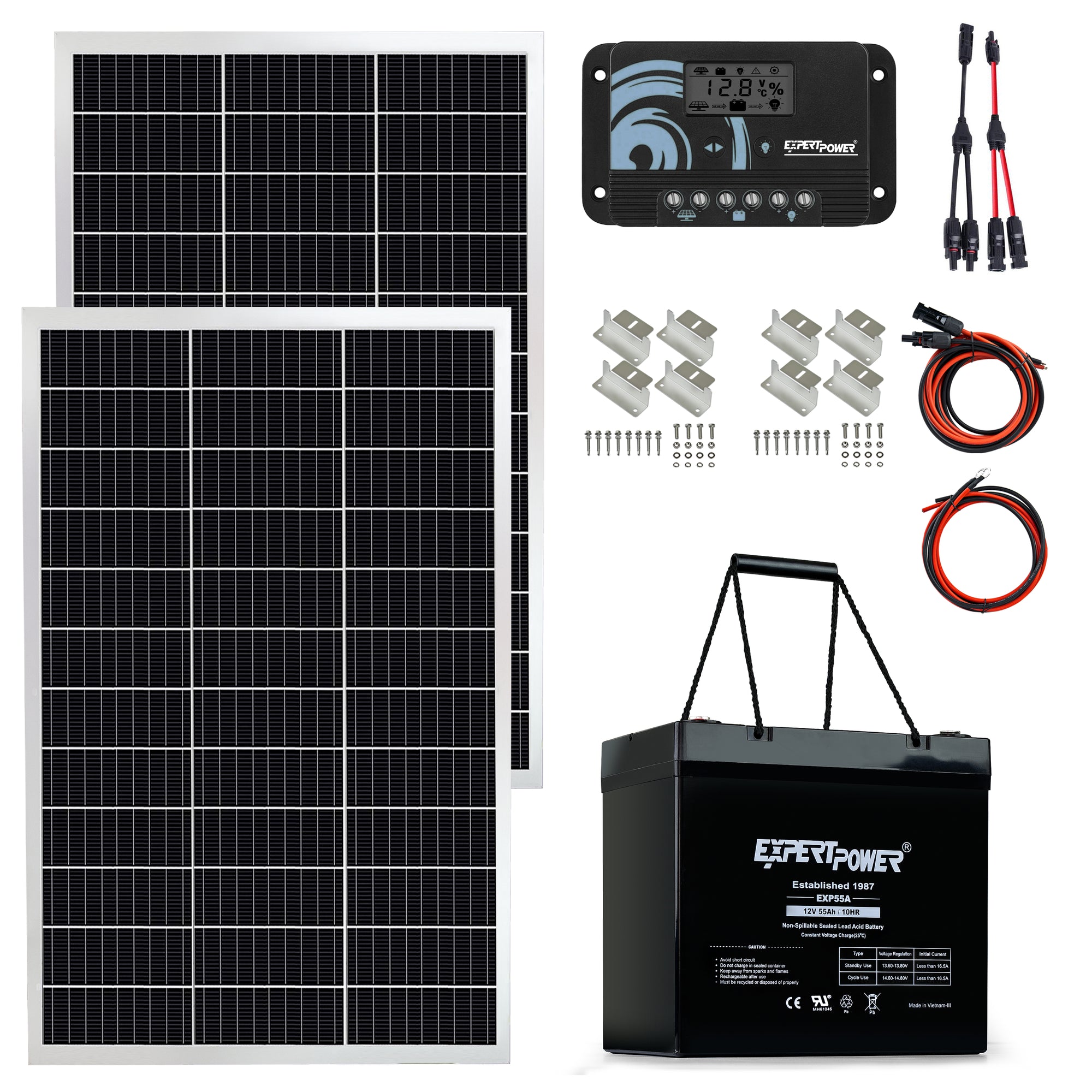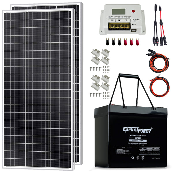 Get ready to power up your off-grid adventures with our ExpertPower Solar Kit! This kit includes all the essential components you need for a starter DIY project. Embrace the sun's energy with the 200W Monocrystalline Panel, utilizing the solar array to charge the included 12V 55AH AGM SLA Battery.