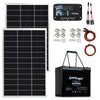This kit includes two 100W Monocrystalline Solar Panel, one 20A PWM Solar Charge Controller, one 12V 55AH AGM SLA Battery, one pair of panel connection cables for parallel connection, one pair of 10ft 12AWG MC4 Solar Cables, one pair of 6ft 12AWG Battery Cables, and two sets of Solar Panel Mounting Brackets.