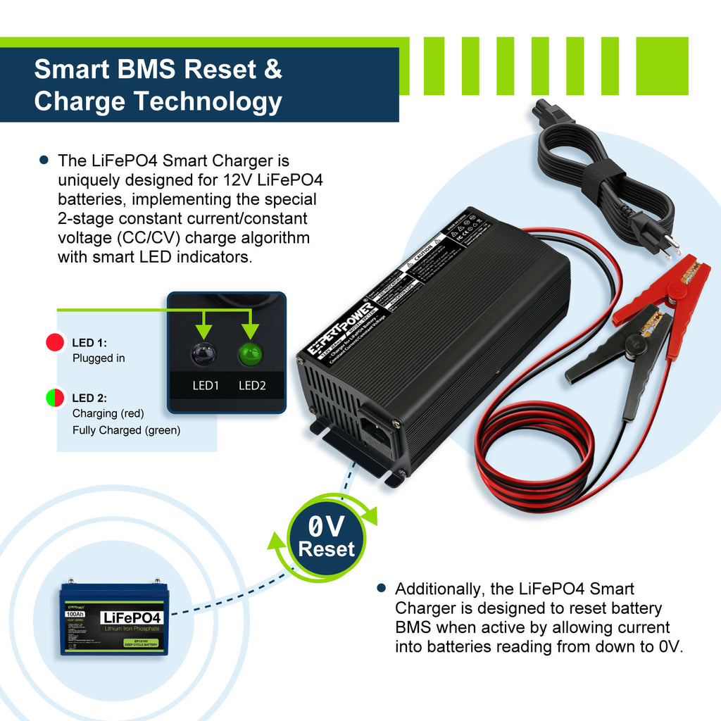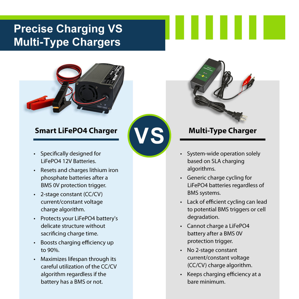 Uniquely designed for 12V LiFePO4 batteries and features a 2-stage constant current/constant voltage (CC/CV) charge algorithm with smart LED indicators.