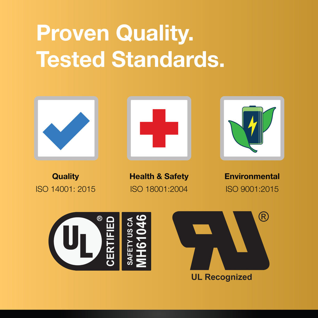 These batteries feature GEL or Absorbant Glass Mat (AGM) Technology and come in an ABS or rugged impact-resistant case. They hold UL, ISO 9001, ISO 14001, and ISO 45001 certifications, ensuring quality and safety. Plus, they're DOT, IATA, and CAB certified, making them approved for transport by ground, air, and sea.